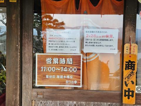 判子を管理している『カリン亭』ですが、給水設備の不具合のためR8.2.28までお休みと、R8.3.29からは閉店する予定の貼紙がありました。